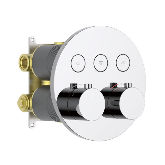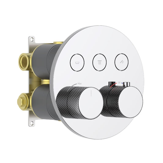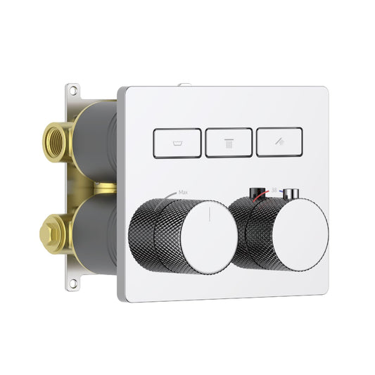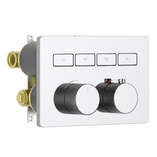 Discover Aquavit thermostatic shower mixers in 2, 3, and 4 outlet options. Made of solid brass with SUS304 trim plate, French Vernet cartridge, and Neoperl push controls. Enjoy precise temperature control, easy operation, and the luxury of running multiple outlets at the same time.