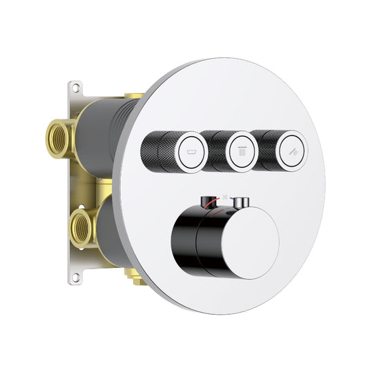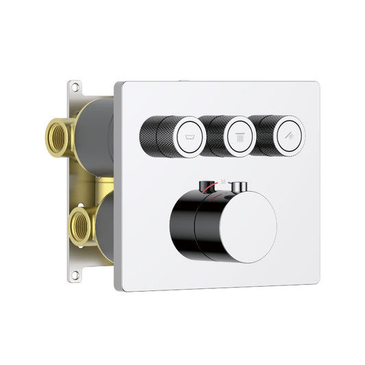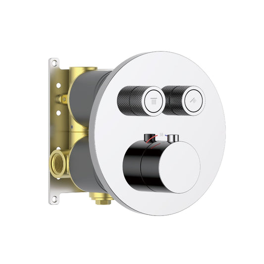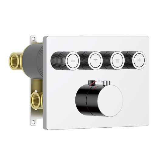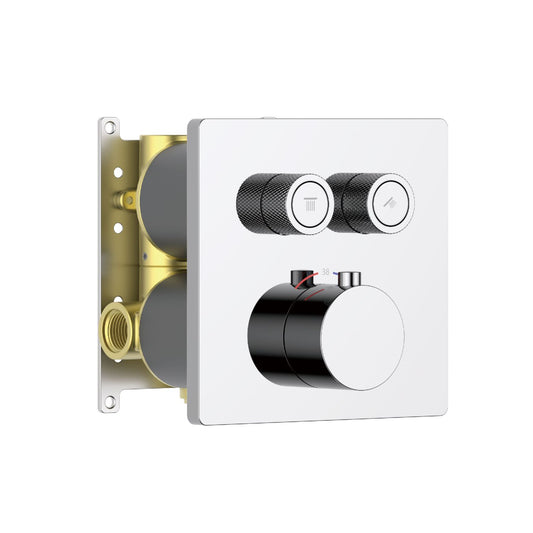 Aquavit C Series thermostatic shower faucet with solid brass body, French Vernet cartridge, Neoperl push-button controls, and built-in part included. Features water volume and temperature control with SUS304 trim plate.