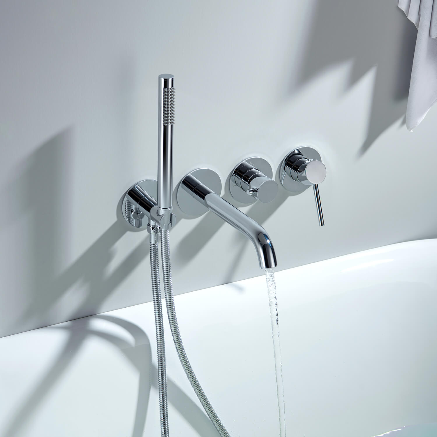In-wall valves with only the spout and handle visible, creating a sleek and space-saving look.