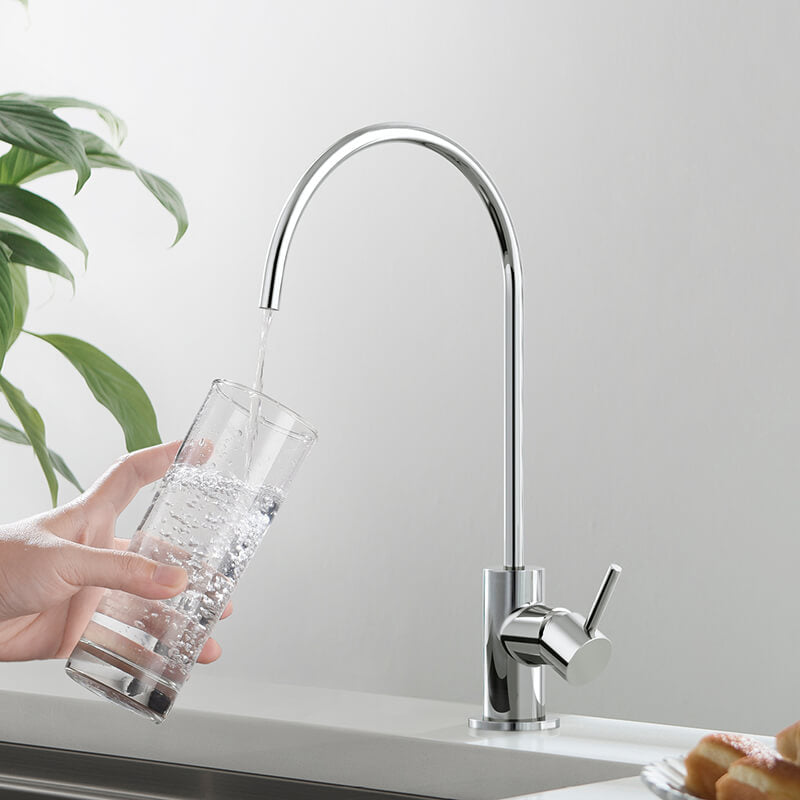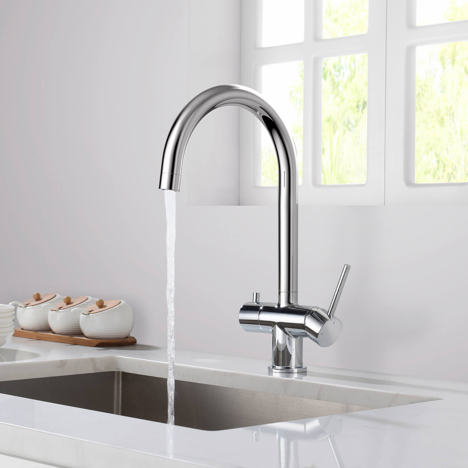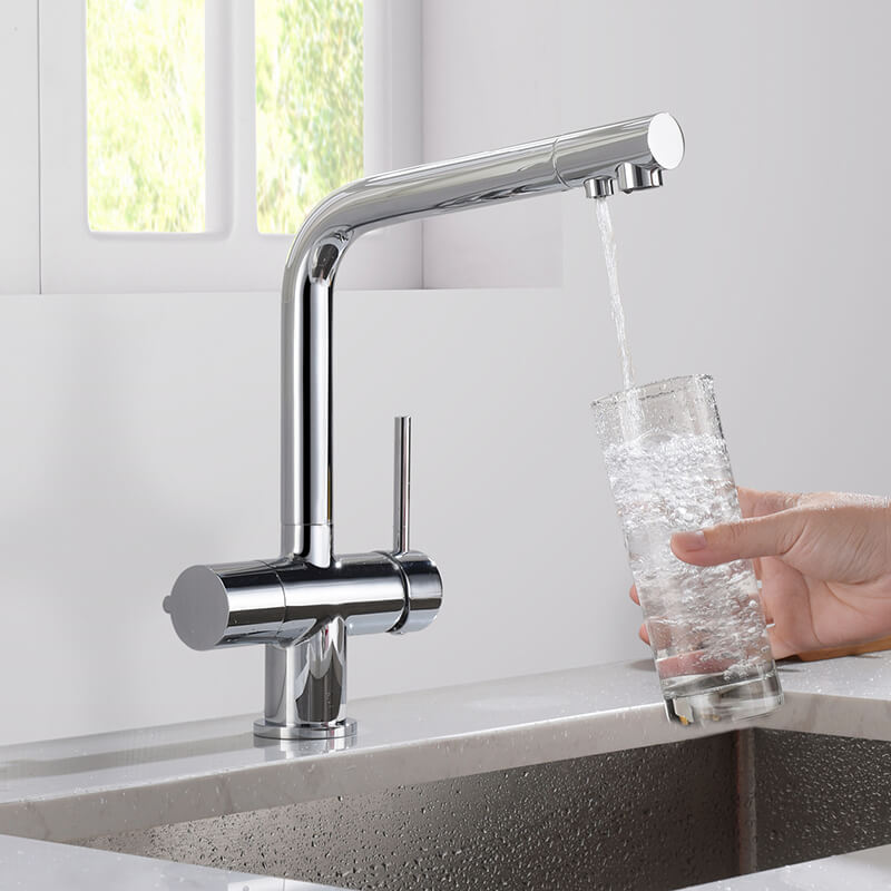 A filtration faucet combining regular hot/cold water, plus a dedicated stream for purified drinking water.