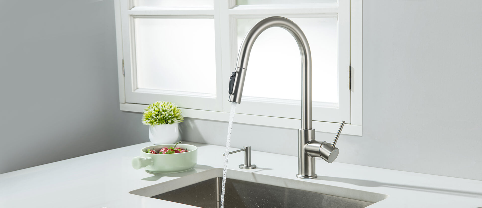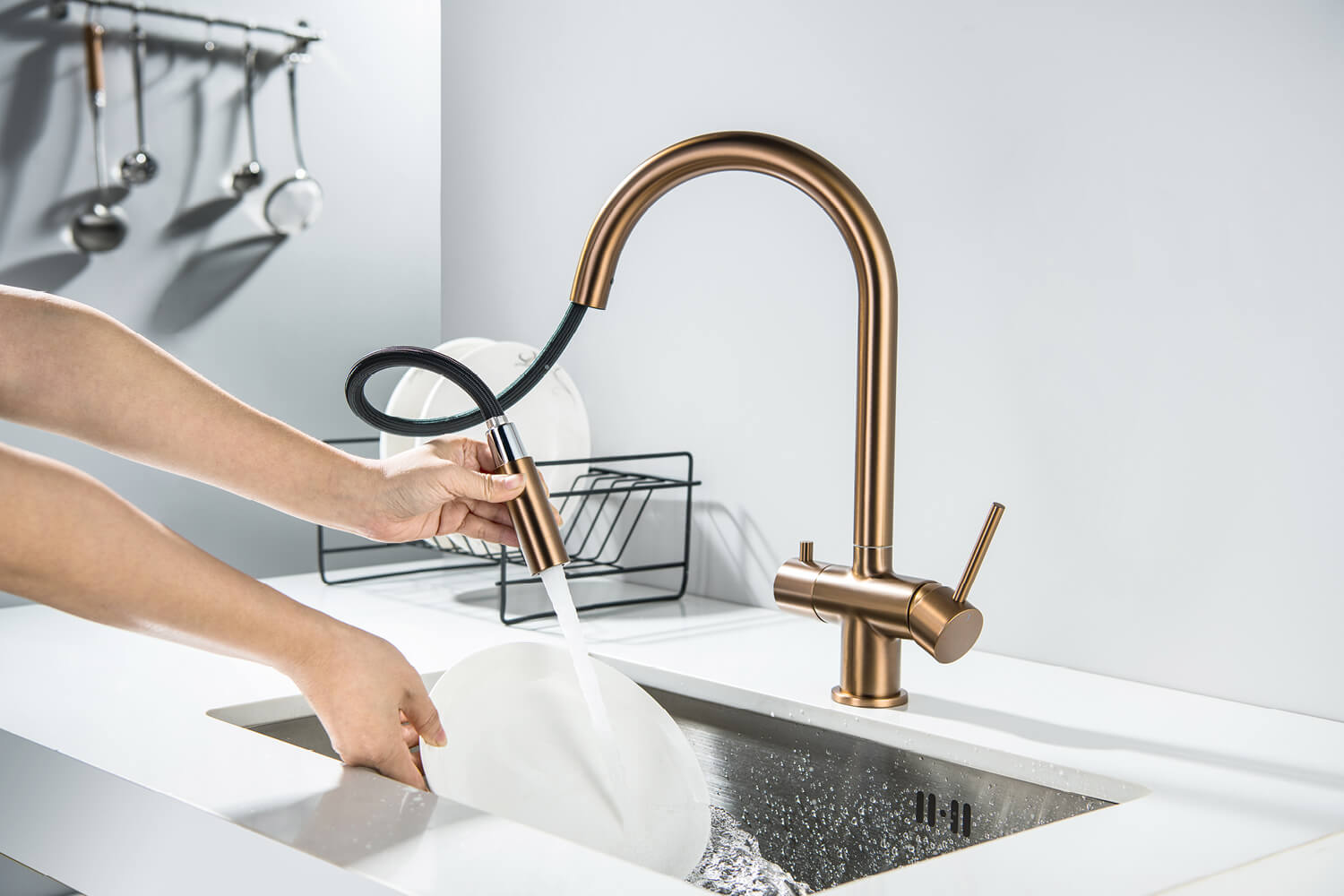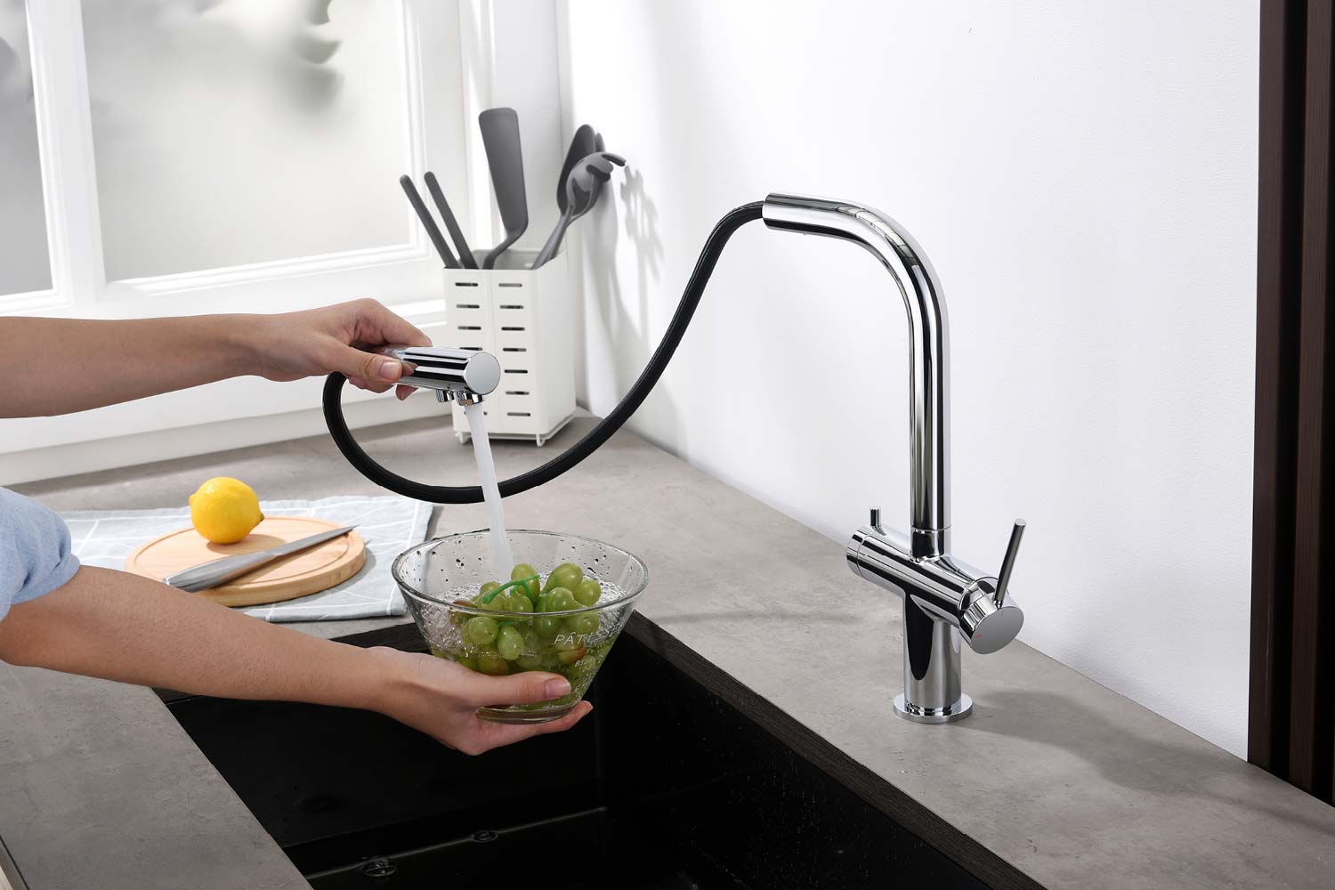 A pull-out kitchen faucet featuring a built-in filtration system for convenient access to clean, filtered water.