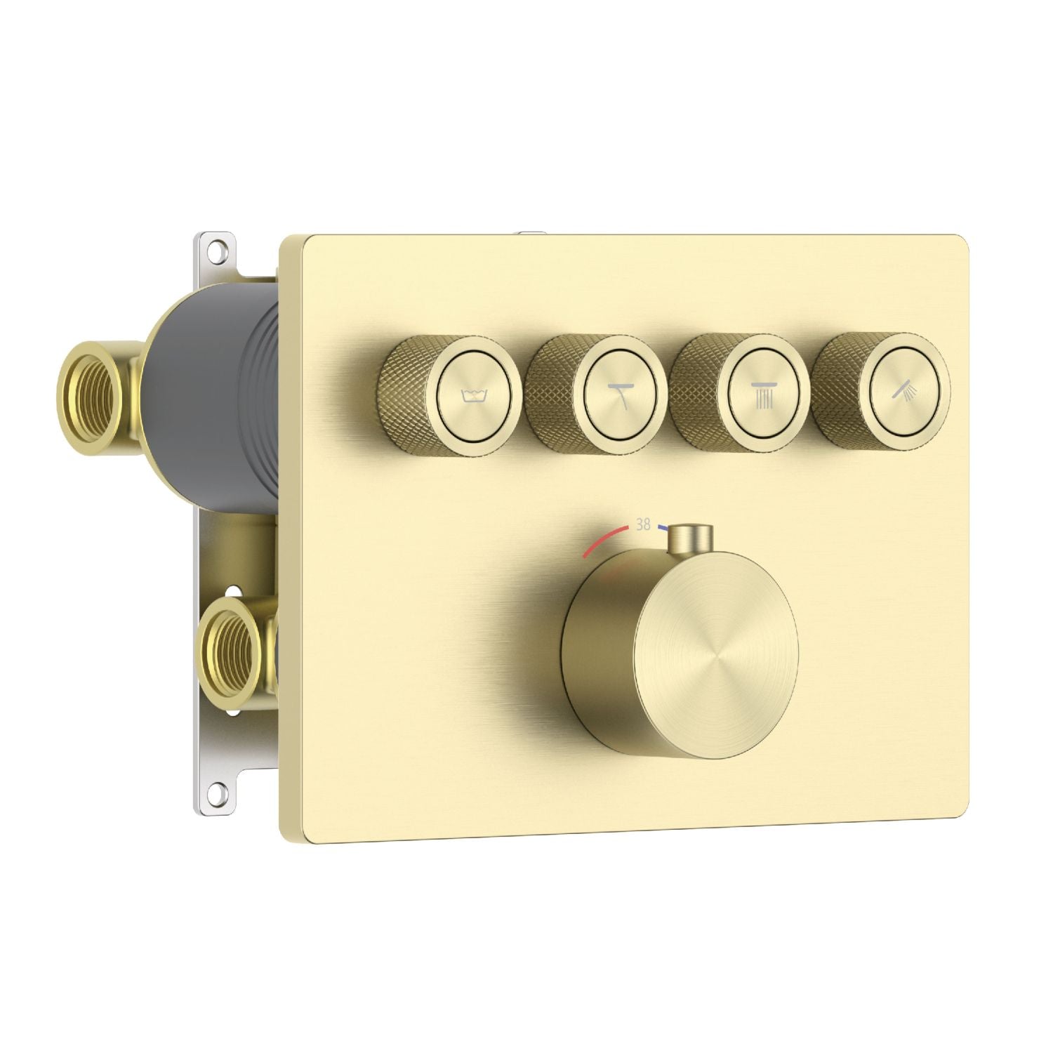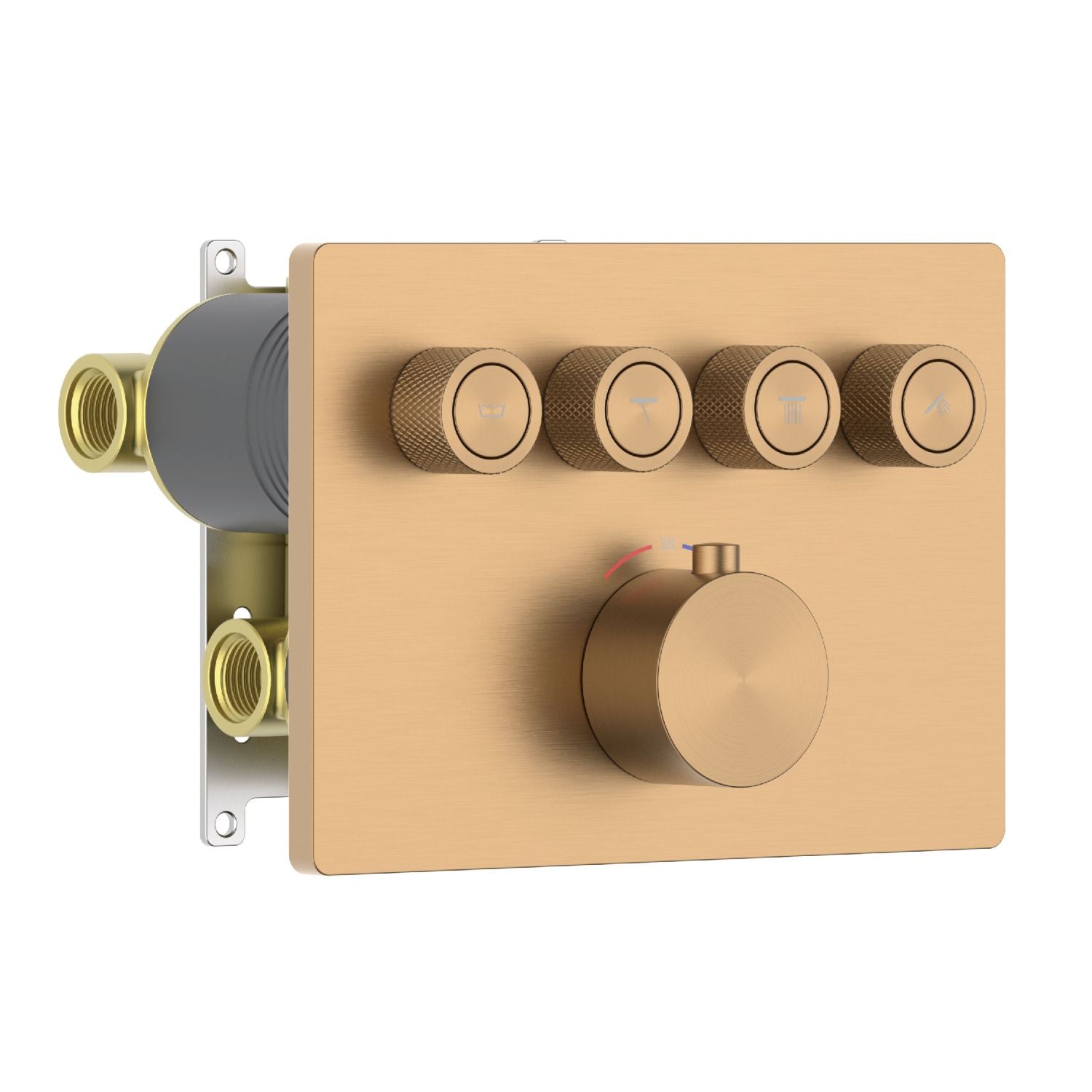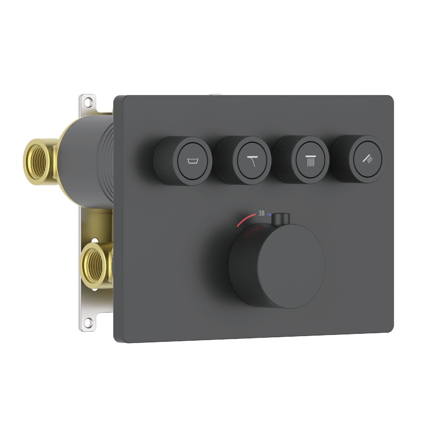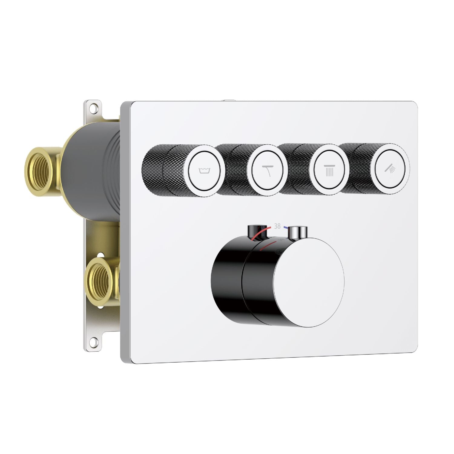 The Aquavit C Series Thermostatic Shower Faucet combines advanced safety with refined design. Crafted from solid brass with a SUS304 stainless steel trim plate, it ensures lasting durability and a premium finish. The French Vernet thermostatic cartridge provides precise temperature stability, while Neoperl push-button controls allow effortless switching between outlets. The built-in part is included for easier installation. The bottom handle regulates water temperature, while the top click diverter offers smooth control of water volume, giving you a customized shower experience. Designed with standard G1/2" connections, this mixer delivers both functionality and style for modern bathrooms.