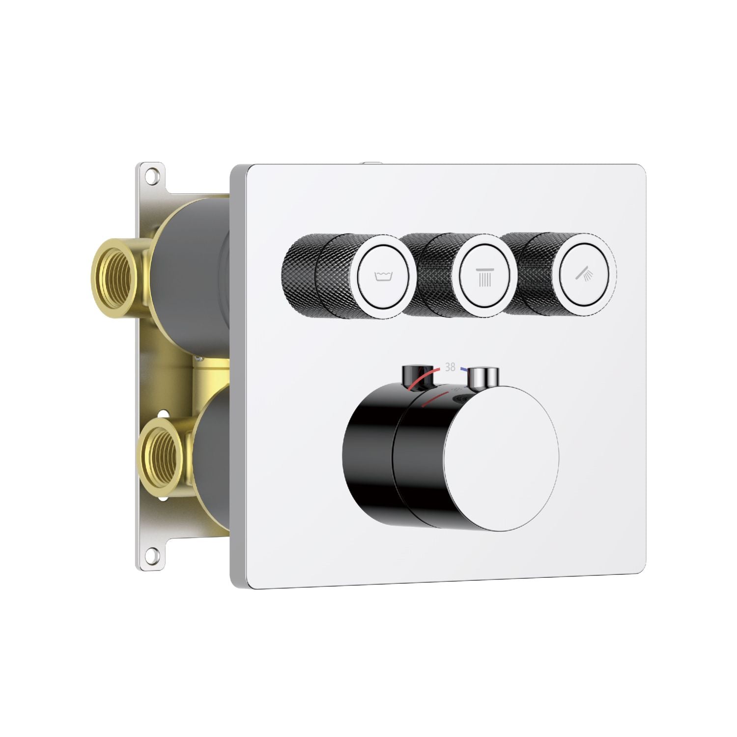 The Aquavit C Series Thermostatic Shower Faucet combines advanced safety with refined design. Crafted from solid brass with a SUS304 stainless steel trim plate, it ensures lasting durability and a premium finish. The French Vernet thermostatic cartridge provides precise temperature stability, while Neoperl push-button controls allow effortless switching between outlets. The built-in part is included for easier installation. The bottom handle regulates water temperature, while the top click diverter offers smooth control of water volume, giving you a customized shower experience. Designed with standard G1/2" connections, this mixer delivers both functionality and style for modern bathrooms.
