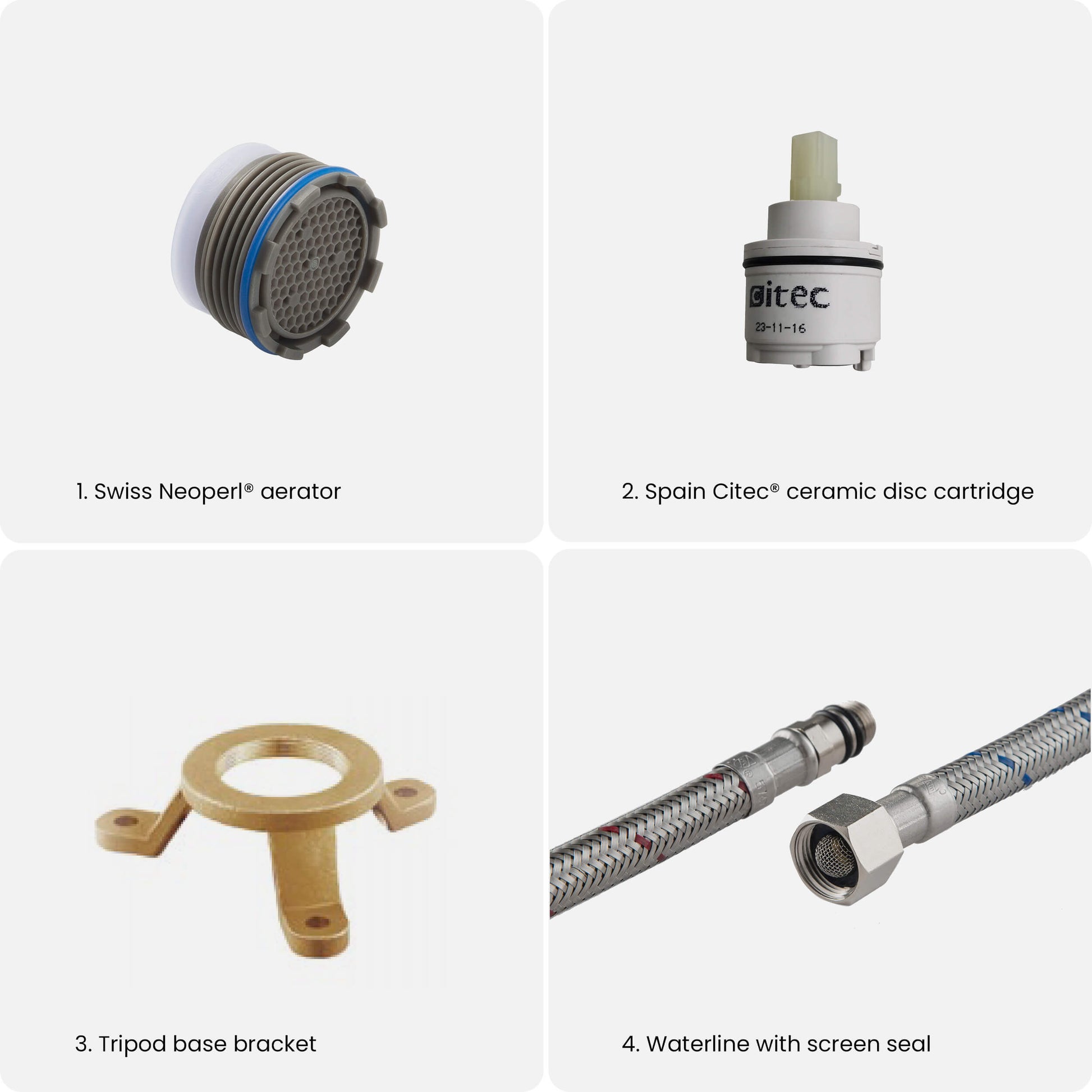 • Swiss Neoperl Aerator: The Neoperl aerator improves water efficiency by mixing air with the water stream, reducing consumption while maintaining high pressure and a clean flow.
