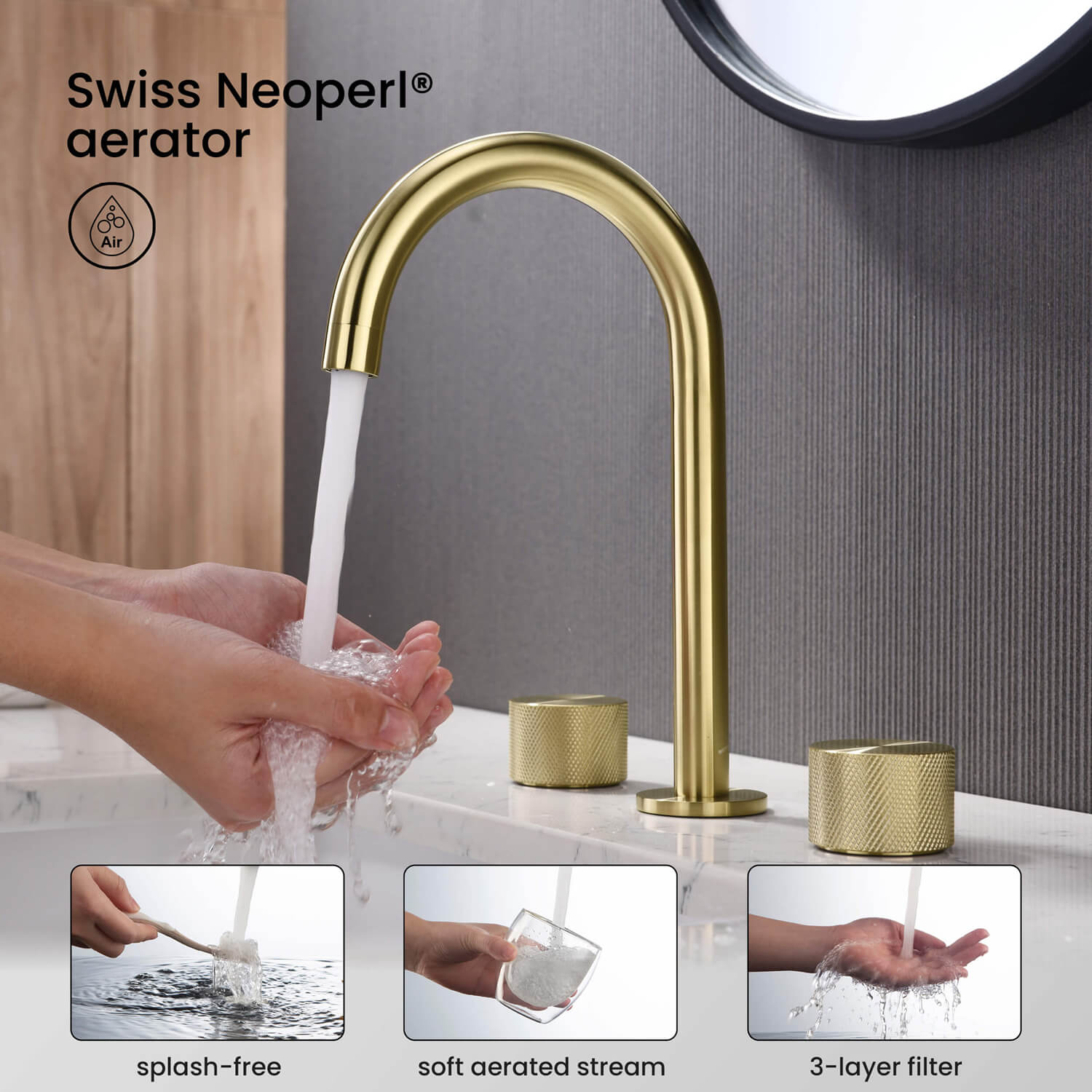 - Swiss Neoperl Aerator: Delivers a gentle, splash-free water stream while conserving water.