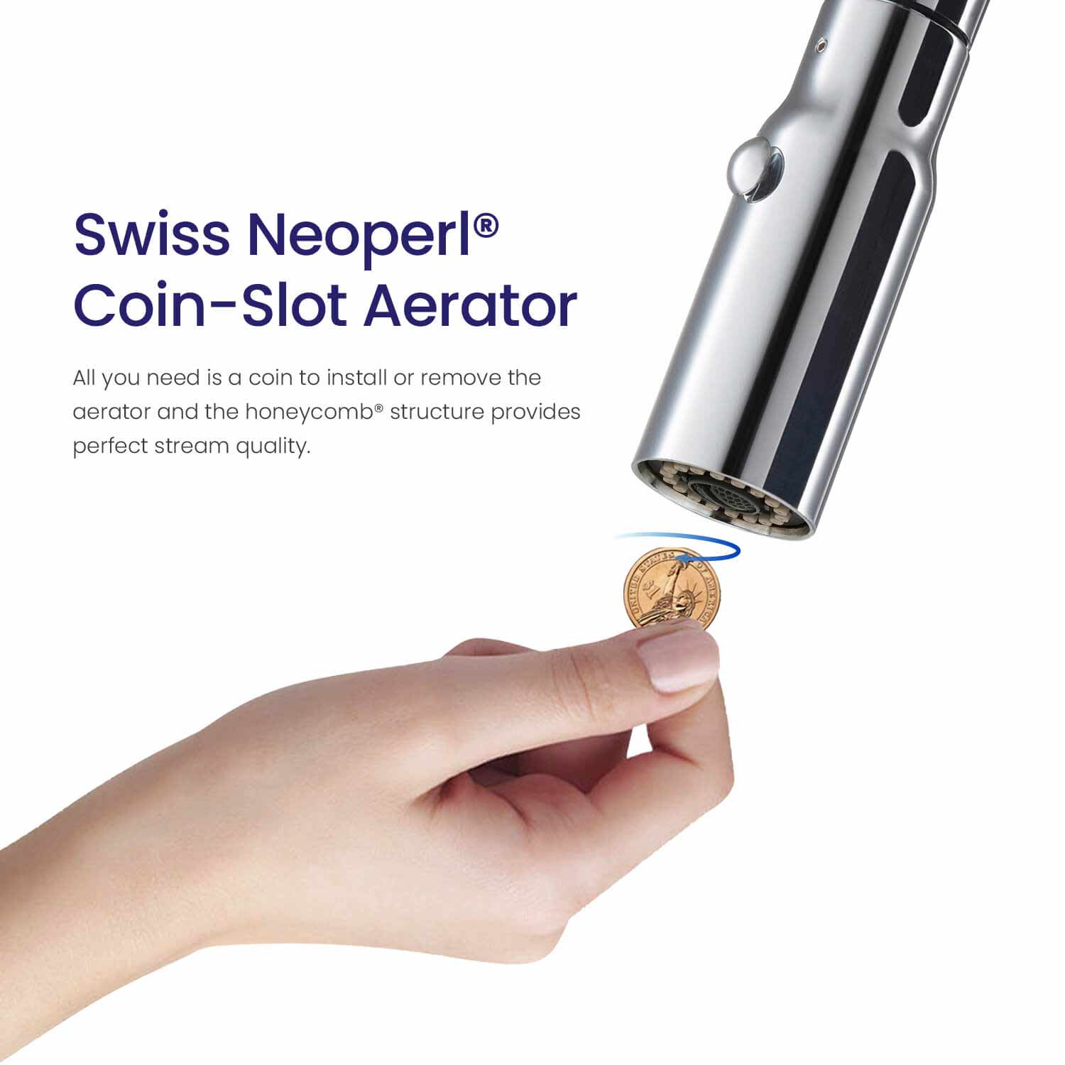 • Splash-Free Water Flow: Equipped with a Swiss Neoperl aerator that delivers a smooth, consistent stream of water while conserving water usage and reducing splashing.